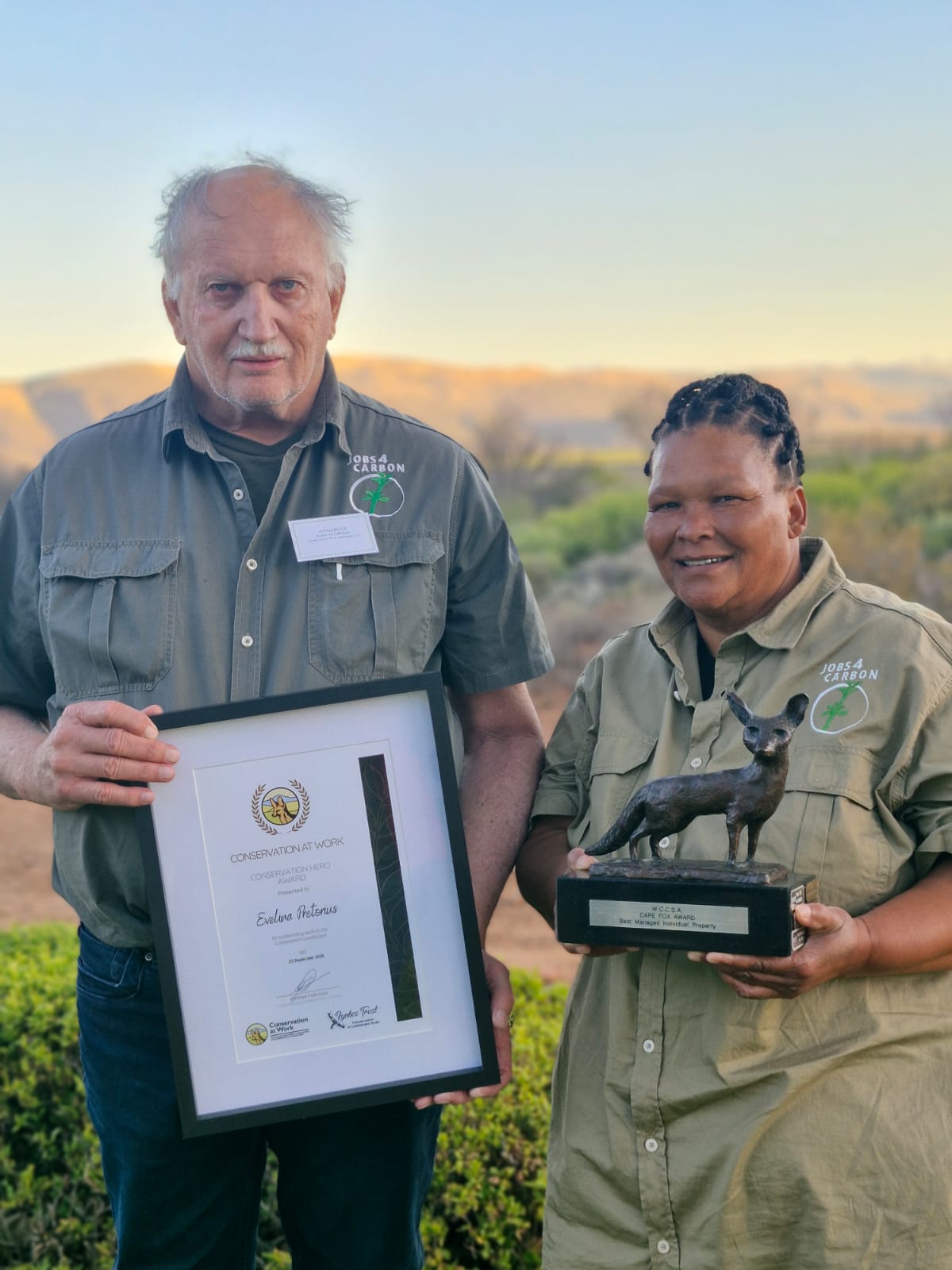 The Cape Fox Conservation Hero Award went to Evelina Pretorius of Jobs for Carbon, whose inspiring journey began in 2015 as one of the first unemployed community members in Van Wyksdorp to join the programme. Today, she leads erosion control projects, supervising up to sixty-two employees. Her team has already rehabilitated 139 hectares of degraded land, including 74.66 hectares in 2025 alone. Evelina’s leadership, marked by gratitude, resilience, and the ability to motivate others, has not only restored landscapes but also created livelihoods.